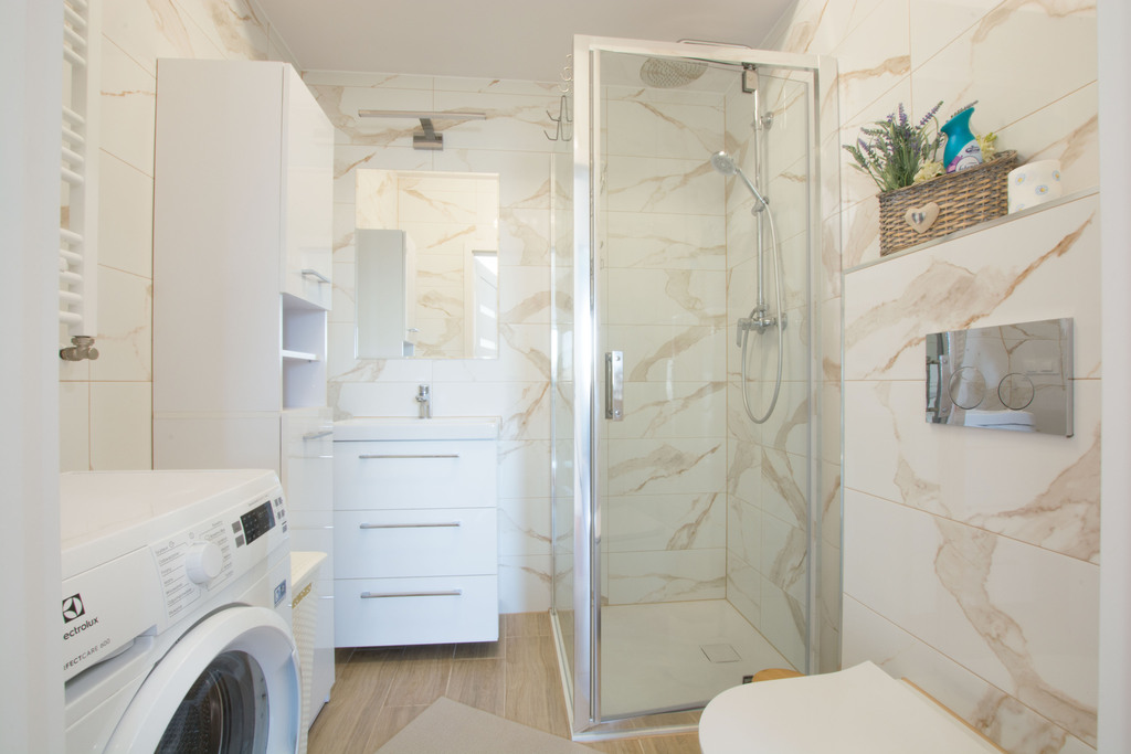 Łazienka wyposażona jest w kabinę prysznicową, pralkę, umywalkę z szafką oraz WC.