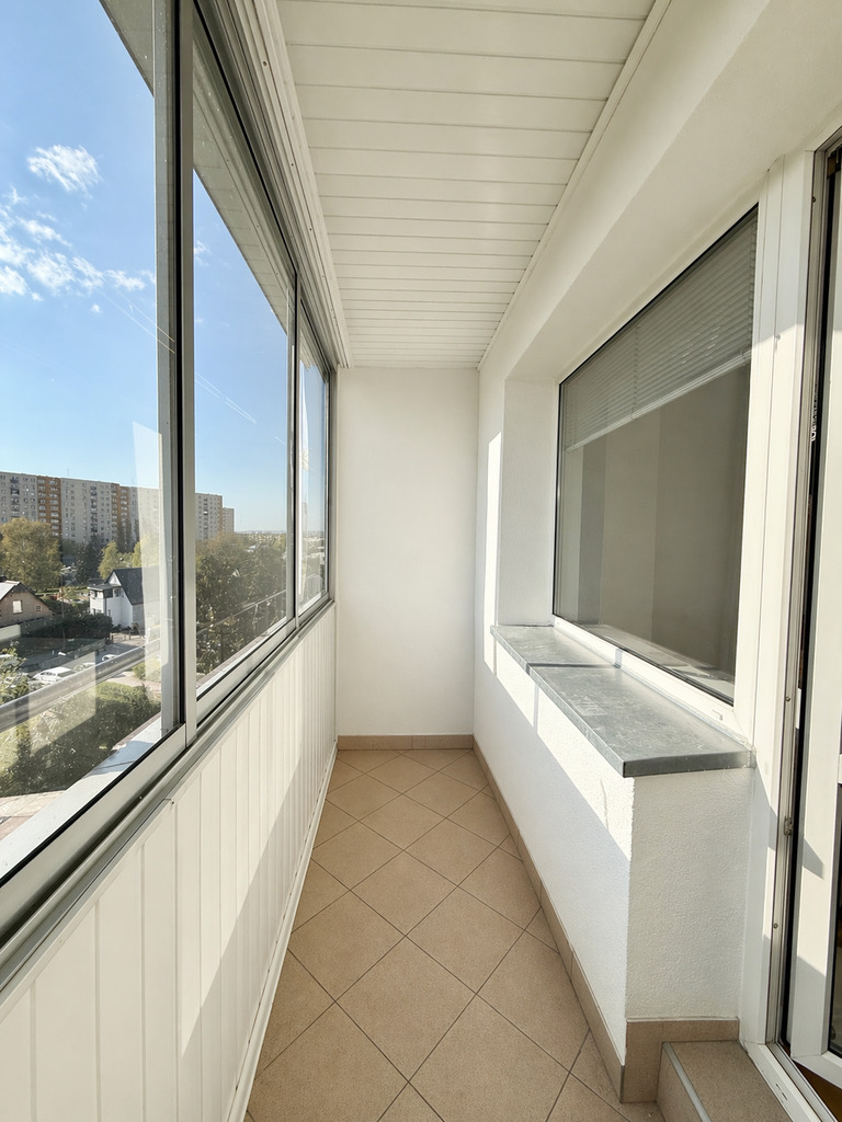 • Duży balkon: Zabudowany balkon z widokiem na zieleń.