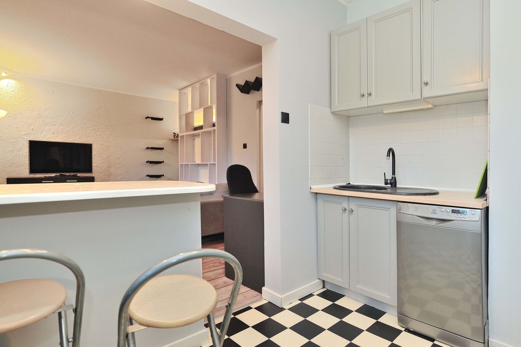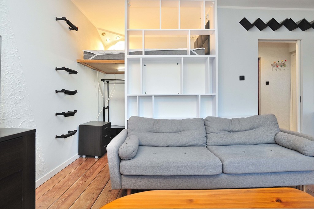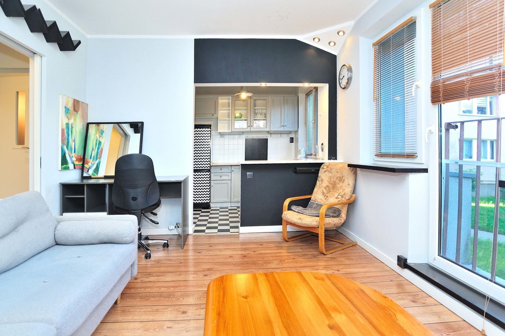 OPIS MIESZKANIA: Do wynajęcia mieszkanie znajdujące się na parterze XII-piętrowego wieżowca. Jego całkowita powierzchnia wynosi 30,81 m2, jest w pełni umeblowane i wyposażone. W mieszkaniu znajduje się pokój z aneksem kuchennym i wyjściem na balkon, łazienka z WC oraz przedpokój. Łazienka wyposażona jest w kabinę prysznicową, pralkę, umywalkę z lustrem, półki na kosmetyki, wc, grzejnik drabinkowy. Kuchnia jest umeblowana i wyposażona w sprzęt AGD - kuchenkę gazową z piekarnikiem elektrycznym, lodówkę z zamrażalnikiem, zmywarkę. W pokoju jest rozkładana kanapa, biurko, cztery stoliki, lampa podłogowa, regał na książki, komoda, szafka, półka nad drzwiami. Niewątpliwym atutem kawalerki jest także wydzielone miejsce do spania za pomocą antresoli z wygodnym materacem i mieszcząca się pod nią garderoba.