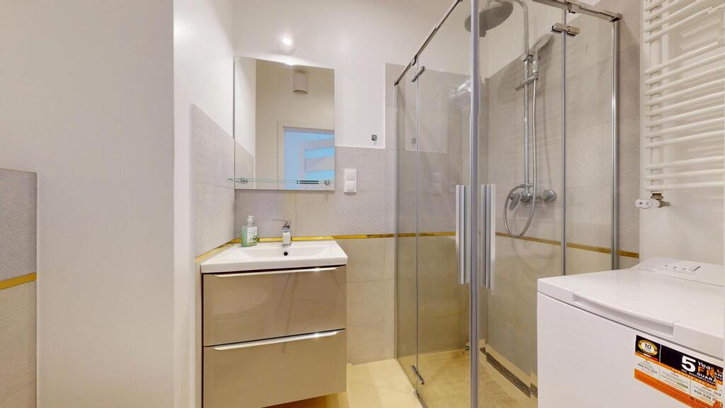 - łazienka z prysznicem, zabudową i pralką