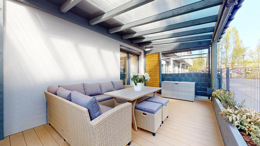 Mieszkanie nowocześnie i solidnie wykończone przy użyciu materiałów wysokiej jakości i wyselekcjonowanej kolorystyki. Kuchnia zabudowana markowymi meblami na wymiar z półwyspą i sprzętem AGD. W korytarzu dwie szafy w zabudowie. Podłogi wyłożone ładnymi panelami, ściany gładkie, malowane. Łazienka w glazurze i terakocie. Drzwi tarasowe zabezpieczone roletą antywłamaniową, dodatkowo we wszystkich oknach plisy. Pergola na tarasie została wyposażona w rolety przeciwsłoneczne.