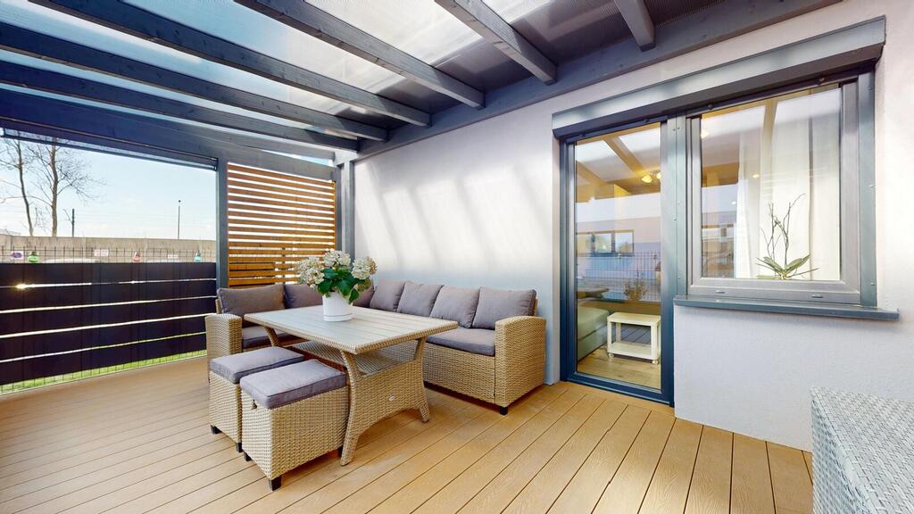 - salon z wyjściem na ogródek zabudowany tarasem i zadaszoną pergolą