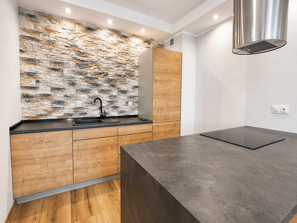 Kuchnia została wyposażona w wysokiej klasy sprzęt AGD (płyta indukcyjna, piekarnik, zmywarka, lodówko-zamrażarka, okap).