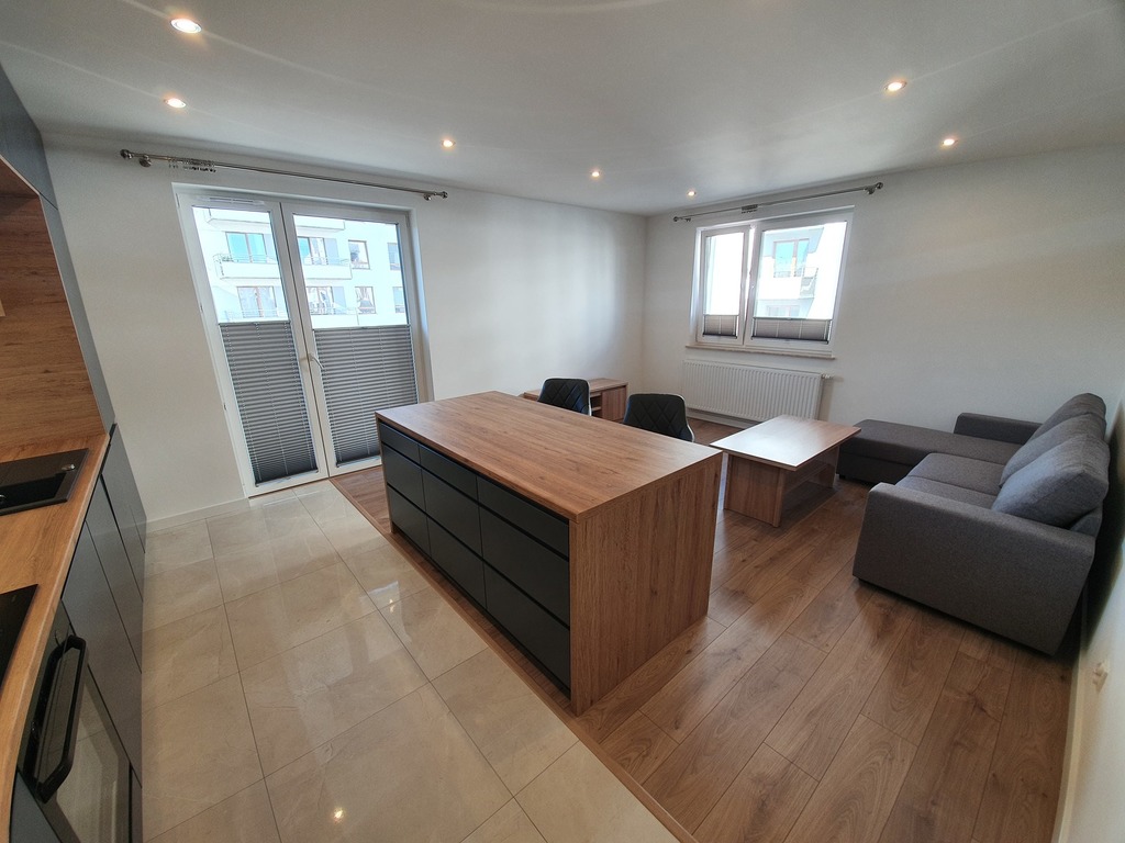 Na wynajem nowocześnie wykończone mieszkanie na ul. Powstańców Śląskich. Bardzo dobra lokalizacja - świetne połączenie z Centrum jak i z dzielnicami zachodnio południowymi Szczecina. Inwestycja z 2020 roku - nowoczesne budynki 6 piętrowe (mieszkanie znajduje się na 2 piętrze) z windami i garażami podziemnymi. Lokal ma 60,62 m2 powierzchni użytkowej i jest w pełni umeblowany (jak na zdjęciach). Obszerny salon z otwartą kuchnią i wyspą kuchenną o powierzchni 25,55m2, bardzo duża ilość szafek i szuflad. Kuchnia jest też wyposażona we wszystkie niezbędne sprzęty AGD (lodówka, zmywarka, piekarnik, płyta indukcyjna). Z salonu dodatkowo mamy wyjście również na balkon. W mieszkaniu są dwie sypialnie o zbliżonych metrażach po ok. 11 i 12 m2 (jedno umeblowane w łóżko i szafę, druga sypialnia ma tylko szafę - więc można samemu ustalić funkcję pokoju). Łazienka w nowoczesnej kolorystyce z dużą kabiną prysznicową, pralką umywalką i wc. W budynku ogrzewanie i woda ciepła z sieci miejskiej (nie ma w ogóle gazu). Do mieszkania przynależy komórka lokatorska (na tym samym piętrze) o pow. ok 3m2 oraz stanowisko w garażu podziemnym na 1 auto (za dodatkowe 350zł/miesiąc). Opłaty dodatkowe to: czynsz administracyjny 1 219,24 zł z zaliczkami na CO i wodę (wymiar przy 3 osobach) oraz prąd (według zużycia). Kaucja 5000zł