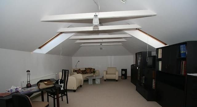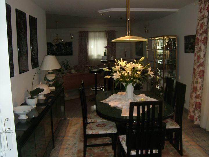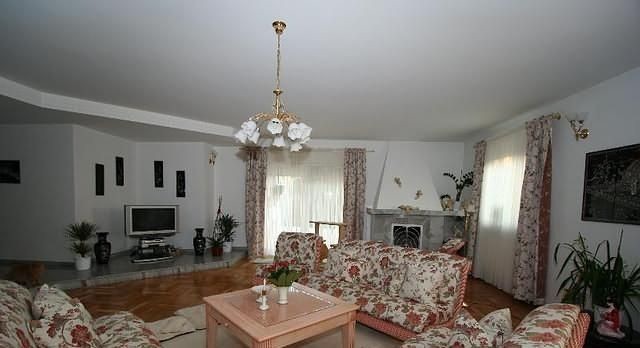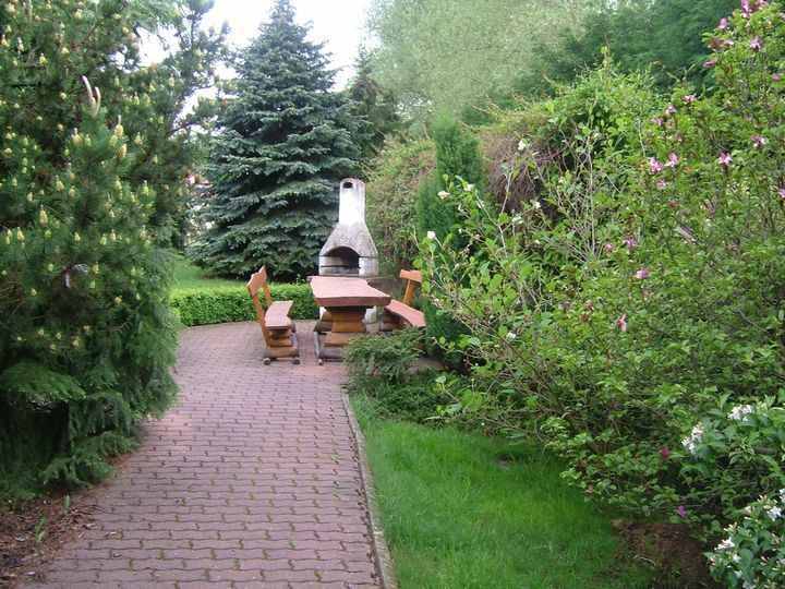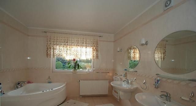 Dom wybudowany według indywidualnego projektu zbudowany z materiałów wysokiej jakości na bardzo dużej działce (działka przeznaczona pod zabudowę wielorodzinną ). Bardzo przemyślany projekt. Dom z wydzieloną częścią wypoczynkową oddzieloną bocznym korytarzem, z którego przechodzi się do czterech samodzielnych pokoi. W tej części są dwie łazienki- jedna z kabiną prysznicową, druga z wanną z hydromasażem. Z holu bezpośrednie wejście do kuchni. Hol przedzielony jest na dwie części drzwiami dwuskrzydłowymi: z pierwszej jest wejście do kuchni i pokoi wypoczynkowych, druga część holu jest w połączeniu z salonem. Salon o powierzchni 70 m2, z bespośrednim wyjściem na zadaszony taras.W salonie kominek. Na pietro prowadzą schody z pierwszej części holu. Tutaj przepiękna otwarta przestrzeń, doświetlona oknami połaciowymi. Jest wydzielona duża przestronna garderoba. Podłoga na poddaszu wyłożona wykładziną dywanową w kremowym kolorze. Podłogi parteru oprócz salonu wyłożone kamieniem naturalnym a w salonie i pokojach parkietem. Kuchnia w pełni wyposażona i umeblowana, połaczona z jadalnią i gościnnym barkiem. Całość podpiwniczona. Piwnice wysokie wyłożone terakotą. Tutaj jest garaż na trzy samochody, pralnia, spiżarnia, pomieszczenie techniczne. Całość niezwykle dobrze utrzymana pod względem technicznym. Dach spadzisty pokryty dachówką cementową w ciemnym kolorze. W ogrodzie basen otwarty o wymiarach 10 x 6 i średniej głębokości 1,5m. Kolorystyka domu utrzymana w ciepłym klimacie.