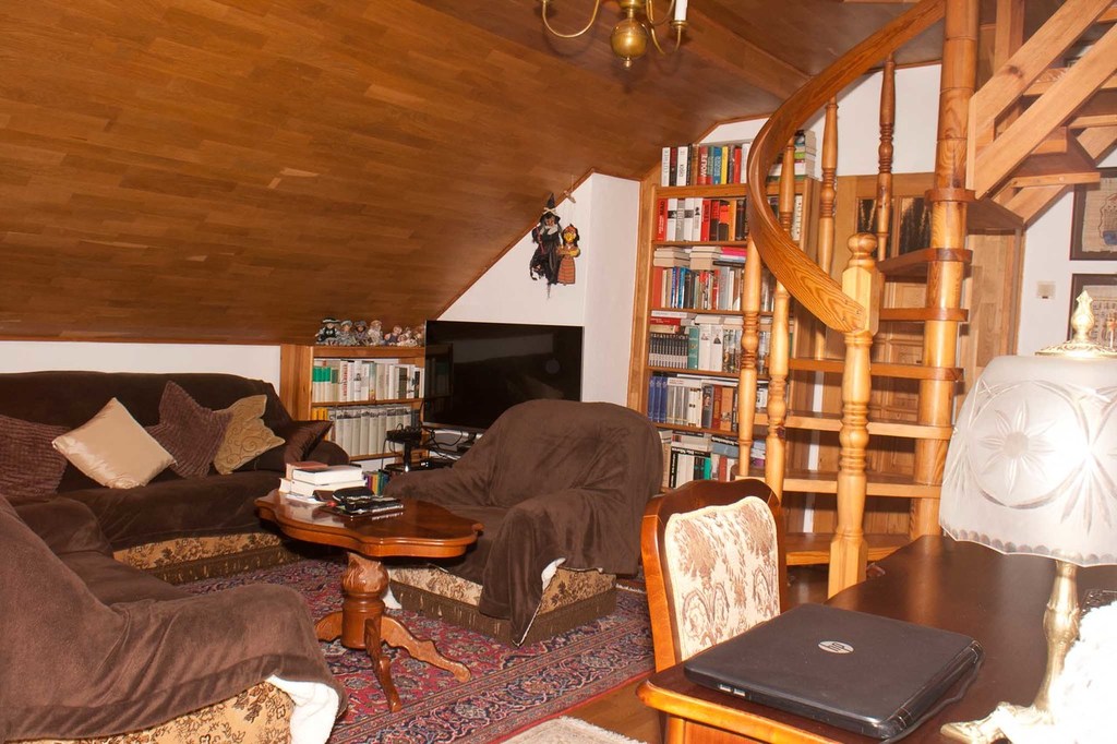 * z pokoju-gabinetu wejście kręconymi schodami drewnianymi na użytkowe poddasze