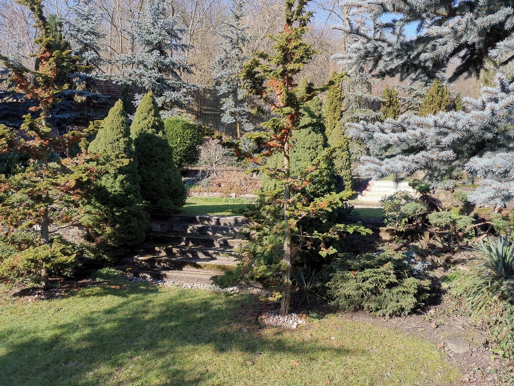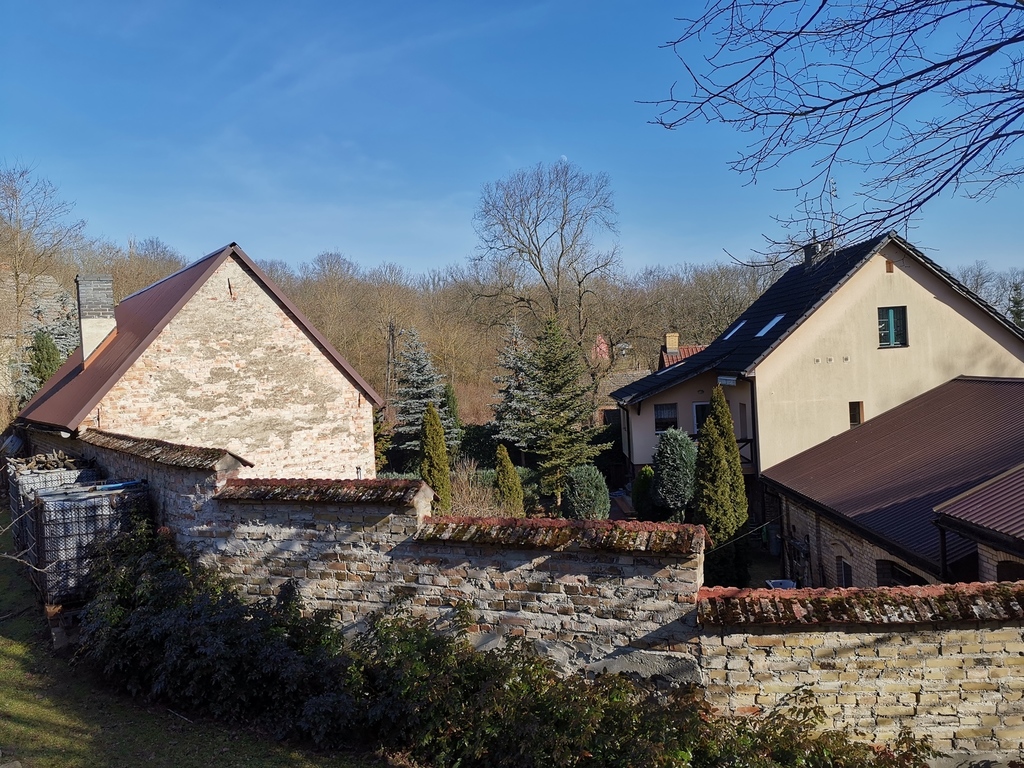 Całość ogrodzona murem ze starych cegieł i kamieni układanych bezspoinowo.