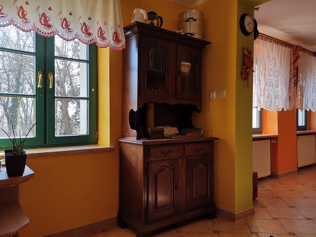 - I piętro z wejściem poprzez taras i werandę ( pod werandą znajduje się piwnica) - kuchnia z zabudową mebli (płyta gazowa, piekarnik, okap,