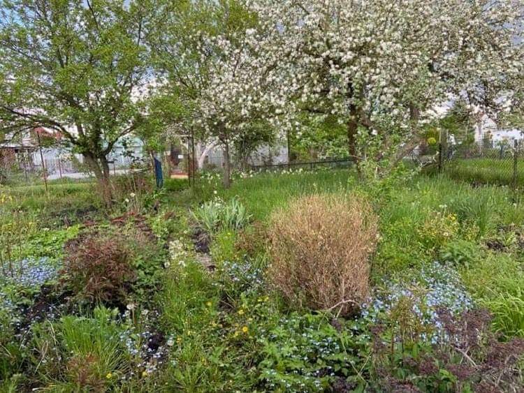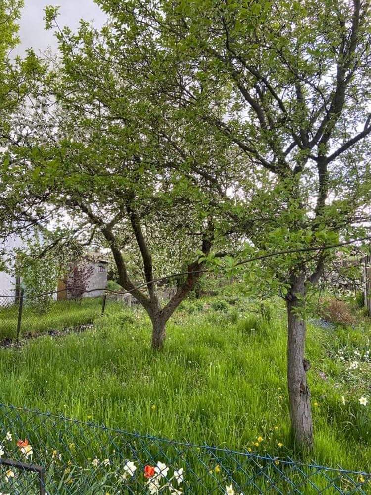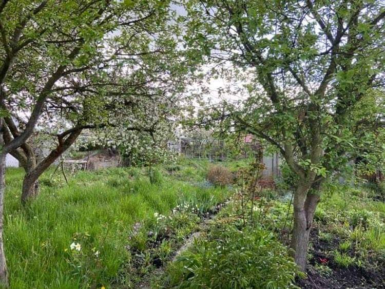 • Działka ogrodzona, zadbana, z licznymi nasadzeniami – m.in. jabłonie, grusza i inne rośliny ozdobne i użytkowe.