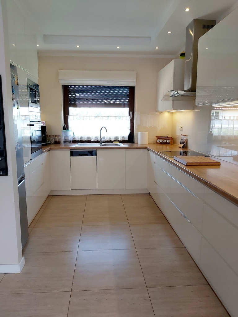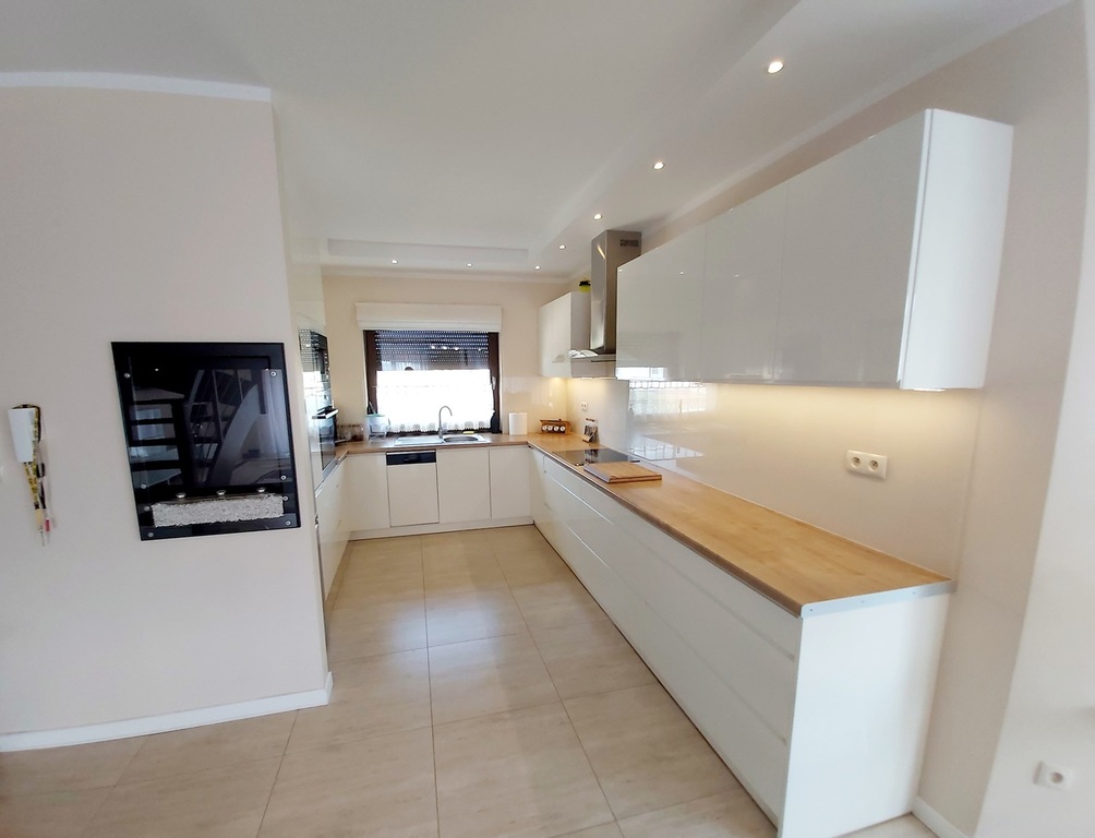 Kuchnia zabudowana na wymiar ładnymi jasnymi meblami, wyposażona w sprzęt AGD w zabudowie.