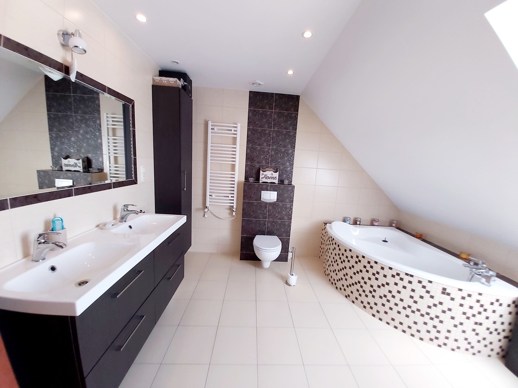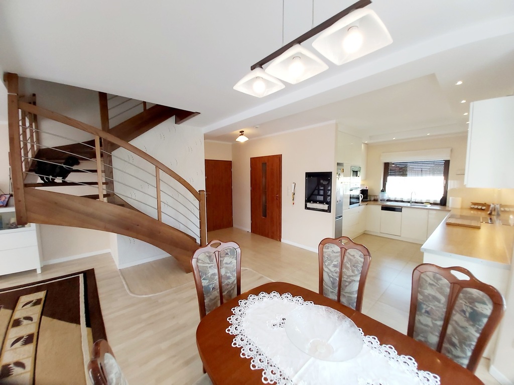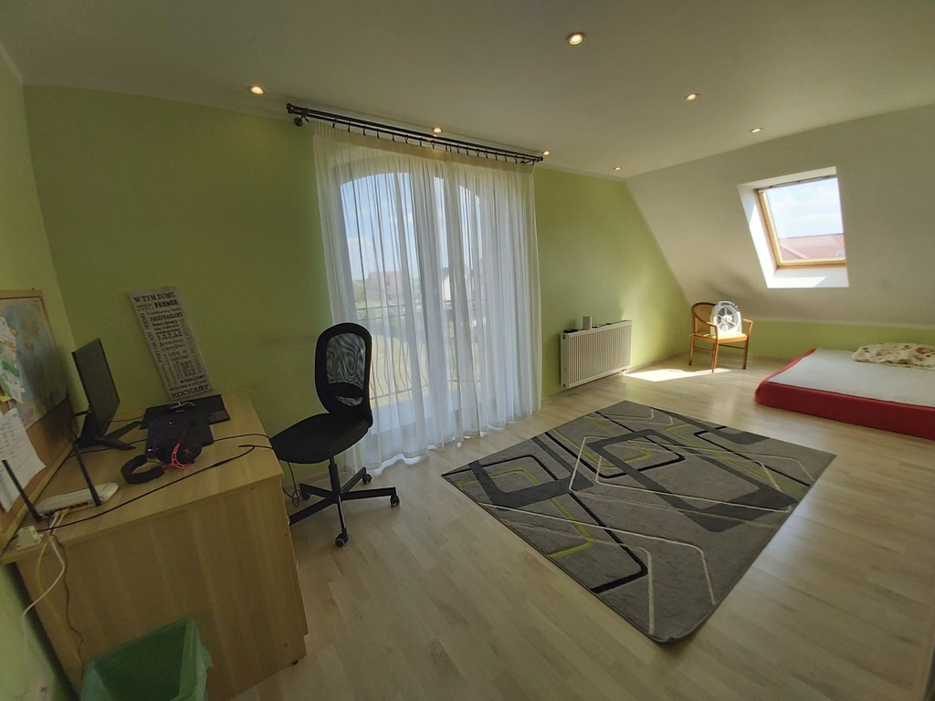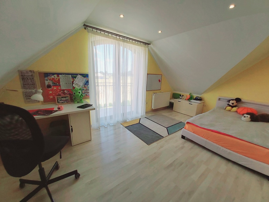 Na piętrze : trzy duże ustawne pokoje , w dwóch z nich wyjścia na balkon , trzeci pokój z wejściem do dużej wygodnej garderoby, duża łazienka typu pokój kąpielowy z wanną narożną oraz kabiną prysznicową.