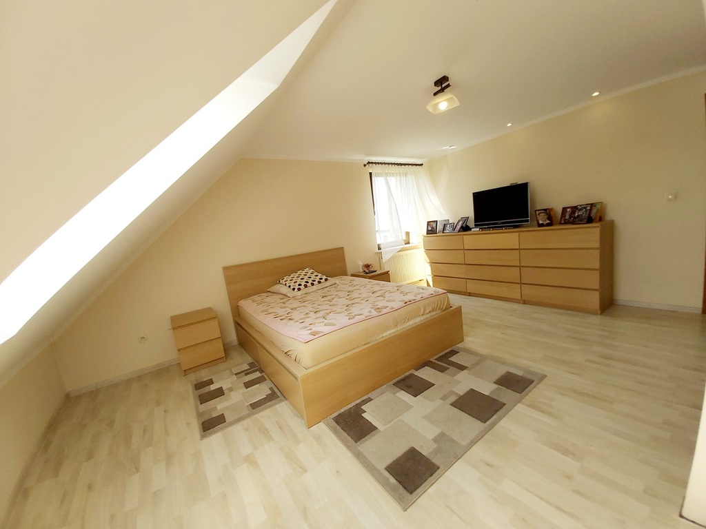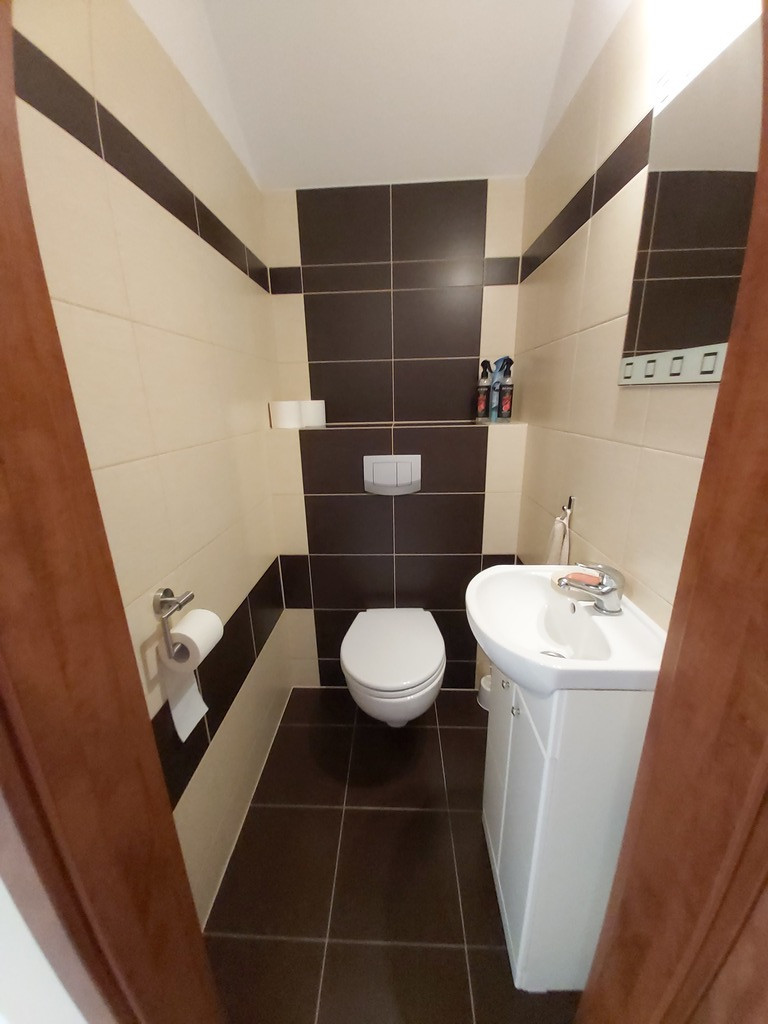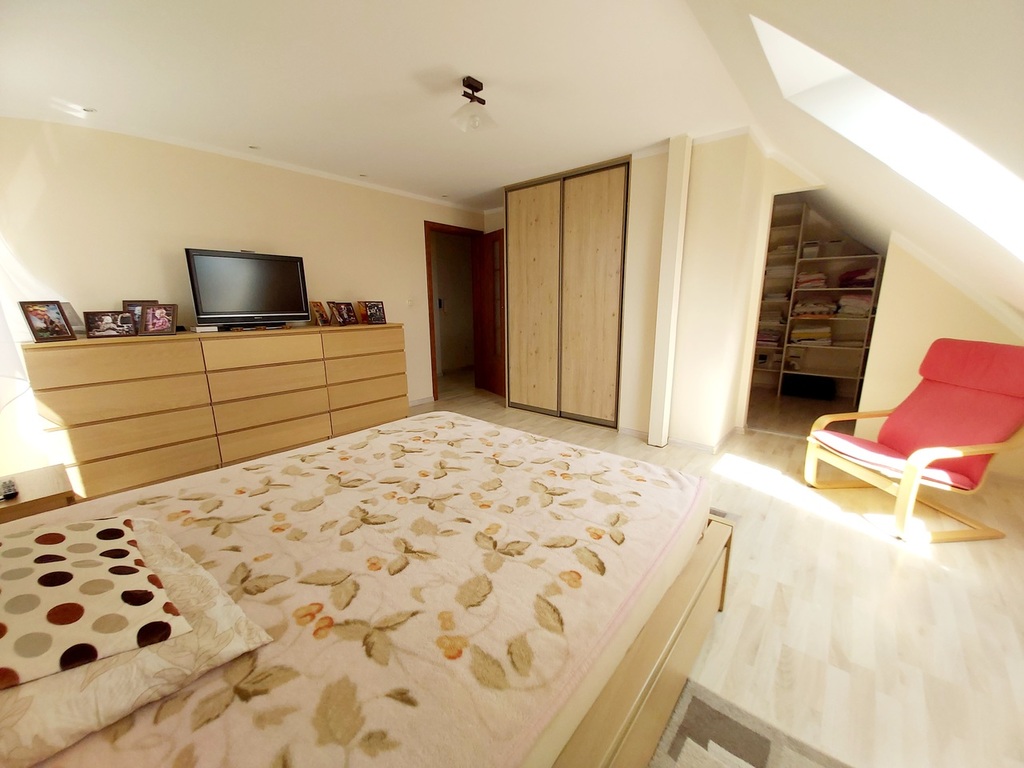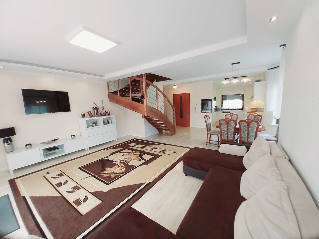 Na piętrze : trzy duże ustawne pokoje , w dwóch z nich wyjścia na balkon , trzeci pokój z wejściem do dużej wygodnej garderoby, duża łazienka typu pokój kąpielowy z wanną narożną oraz kabiną prysznicową.